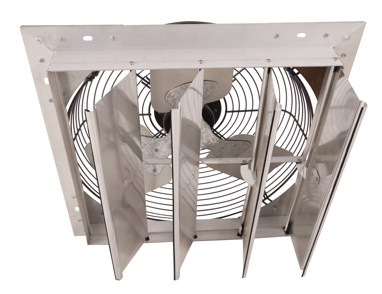 Shutter Mounted Exhaust Fan is perfect for removing excess heat, moisture, dust and odors from virtually any residential or commercial space. Applications include: workshops, welding rooms, restaurants, factories, warehouses, barns, and greenhouses. This wall mounted exhaust fan features aluminum blades, OSHA compliant wire guards, and automatic gravity shutters that open and close in conjunction with the operation of the fan. The completely enclosed motor is thermally protected and permanently lubricated. This fan comes fully assembled and ready to install out of the box.