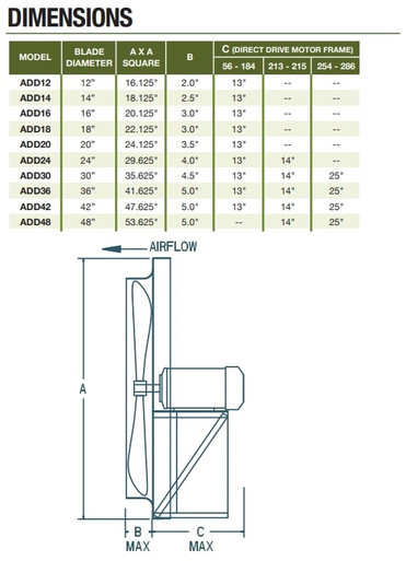 Specs for ADD Panel Mount Exhaust Fan 14 inch 1450 CFM Direct Drive 3 Phase ADD14T30033CM