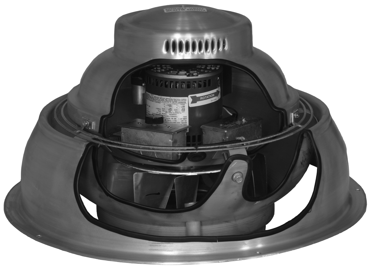Centrifugal Wall Mounted Exhauster Direct Drive Fans (CWD) are designed to exhaust air up to 3,360 CFM, with high static pressure capability up to 1". The spun aluminum exterior provides a pleasing appearance, weatherproof construction, and resistance to corrosion. The low silhouette design is less noticeable on the building exterior, and the removable dome provides easy access to the fan interior for service and cleaning. The non-overloading backward inclined centrifugal wheel with its high static pressure capability makes it suitable for either ducted or non-ducted applications. It should be used where a sidewall mounted location is preferred to roof mounting. Direct drive units use smaller diameter wheels with lower RPM's, resulting in low sound levels and quieter operation. They have no belts or fan bearings to maintain or adjust and consequently require very little maintenance.