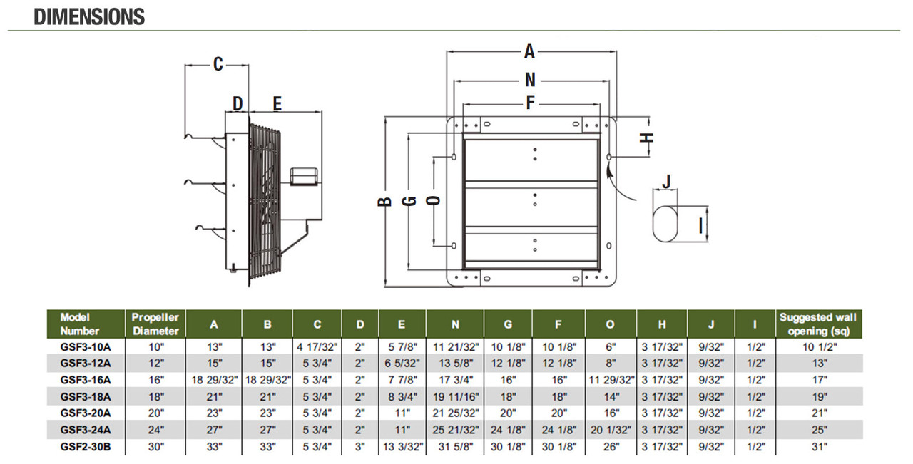 Specs for GSF Galvanized Shutter Fan 24 inch w/ Cord, Plug & Thermostat 4244 CFM 3 Speed GSF3-24A