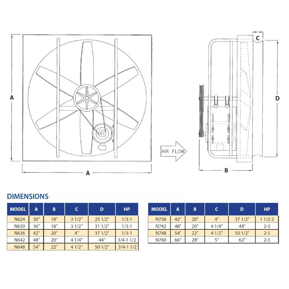 Specs for AirFlo-N600 Panel Mount Exhaust Fan 24 inch 6200 CFM Belt Drive N624-C-1-T
