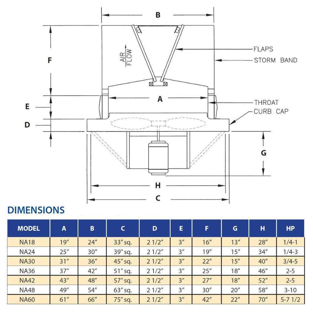 Specs for AirFlo-NA Roof Exhaust Fan 48 inch 37000 CFM 3 Phase Direct Drive NAL48-J-3-T