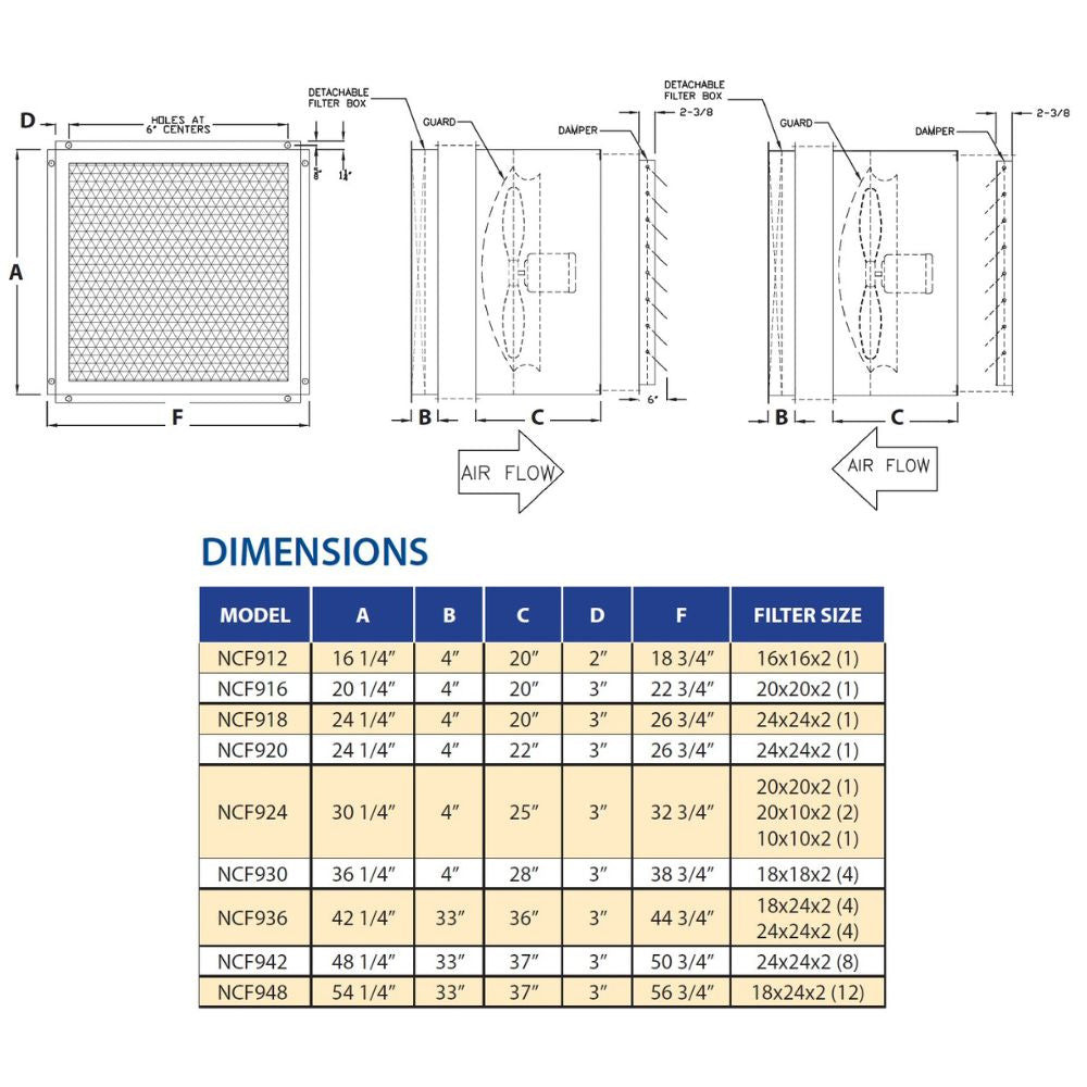 Specs for AirFlo Explosion Proof Filtered Exhaust Fan 16 inch 2000 CFM Direct Drive 3 Phase NCFE16-A-3-E