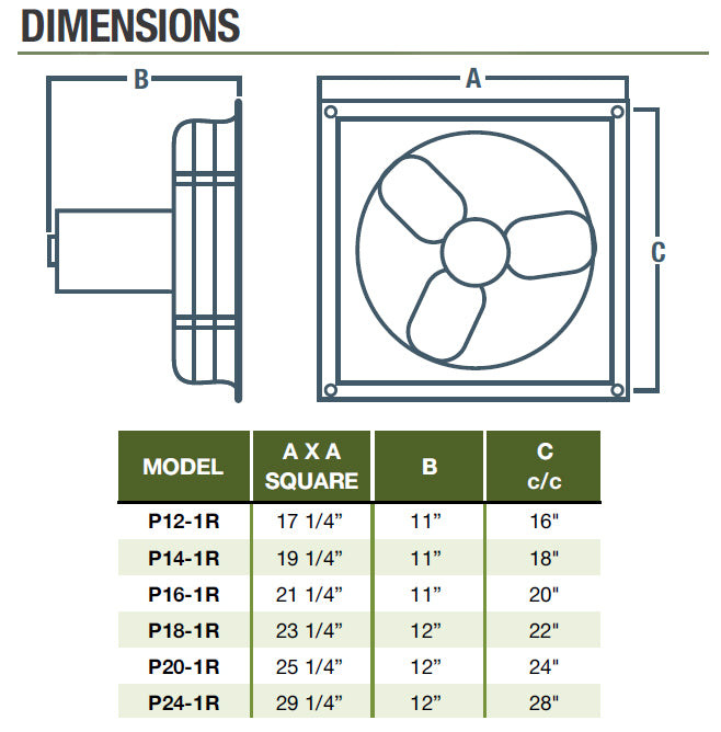Specs for Wall Mount Supply Fan w/ Motorized Shutters 12 inch 1450 CFM Direct Drive P12-1RS9M115