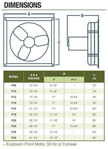 Specs for Explosion Proof Panel Mount Exhaust Fan 12 inch 1640 CFM 3 Phase Direct Drive P12-4M