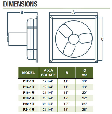 Specs for Wall Mount Supply Fan w/ Motorized Shutters 16 inch 2310 CFM Direct Drive P16-1RS9M115