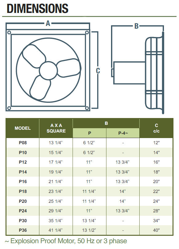 Specs for Explosion Proof Panel Mount Exhaust Fan 18 inch 3200 CFM 3 Phase Direct Drive P18-4M