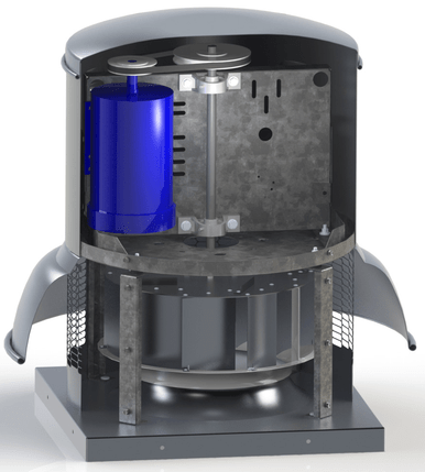 SDB belt drive fans are designed to exhaust air in high static pressure applications to 1-3/4". Belt drive results in lower operating RPM and sound levels, making the Model SDB well suited to applications where quiet operation is important. The non-overloading backward inclined wheel with its higher static pressure capability makes this unit suitable for either ducted or non-ducted applications. It's roof mounting permits location near the area to be ventilated, allowing short duct runs and more efficient operation.