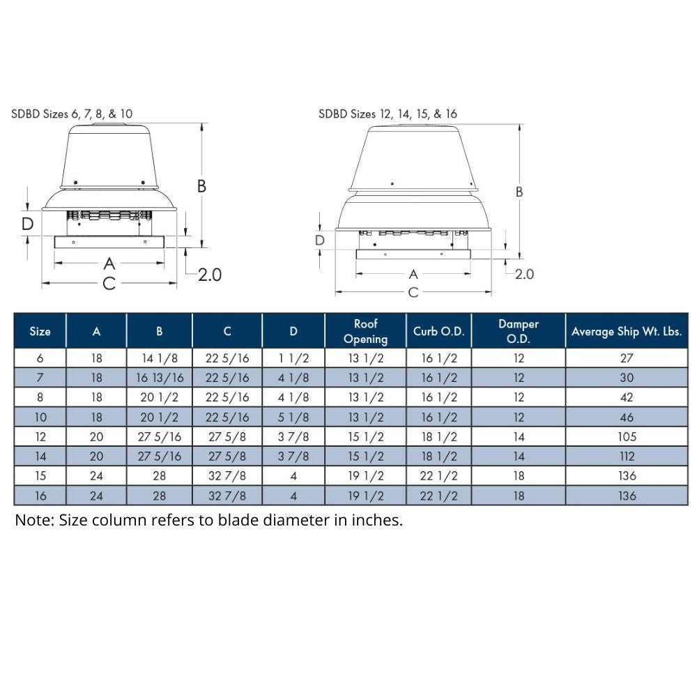 Specs for SDBD Centrifugal Roof Exhaust 6 inch 351 CFM 230 Volt Direct Drive SDBD06JH1CS