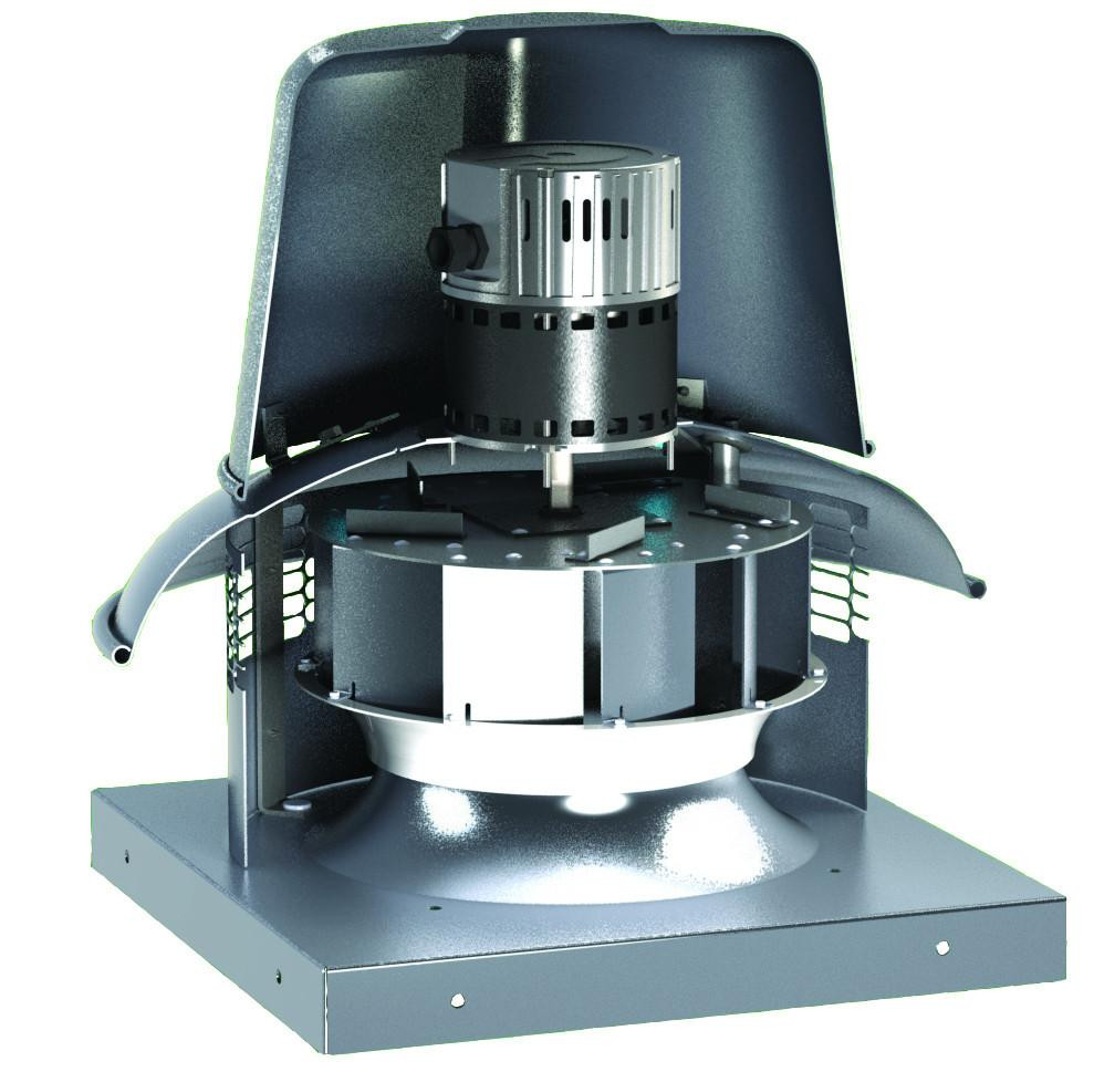 Model SDBD direct drive fans are designed to exhaust air in high static pressure applications to 1-1/2”. The spun aluminum exterior provides an attractive appearance. The non-overloading backward inclined wheel with its higher static pressure capability makes this unit suitable for either ducted or non-ducted applications. Its roof mounting permits location near the area to be ventilated, allowing short duct runs and more efficient operation.