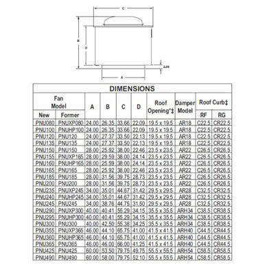 Specs for US Fan Upblast Centrifugal Roof Exhaust 18.5 inch 6704 CFM 3 Phase Belt Drive USPNU185RF0145