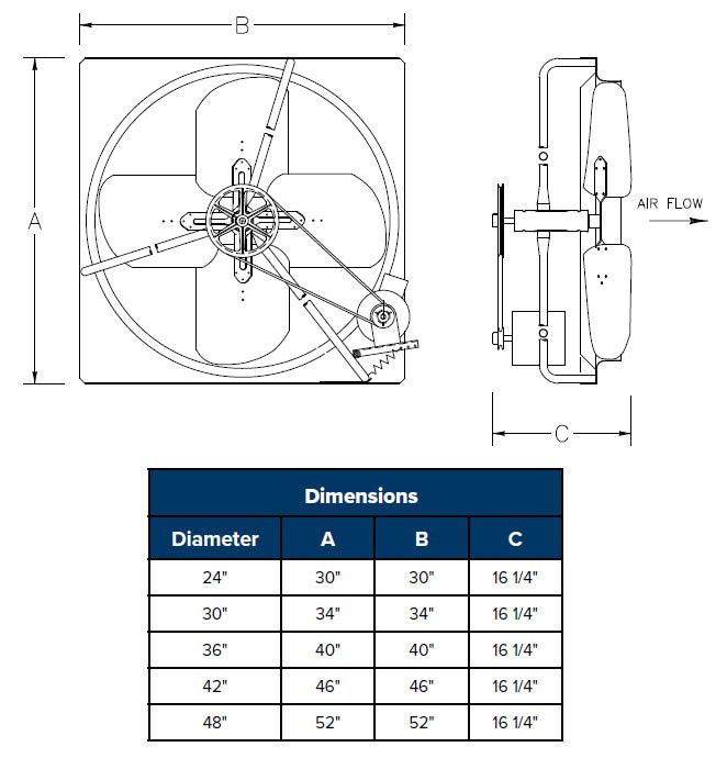 Triangle’s V Series Belt Drive Industrial Wall Exhaust Fans are designed with long lasting performance in mind and are well suited for exhausting factories, gymnasiums, and warehouses. Each of the V Series Industrial Wall Exhaust Fans come standard with automatic belt tensioning to reduce maintenance and to extend motor and belt life.