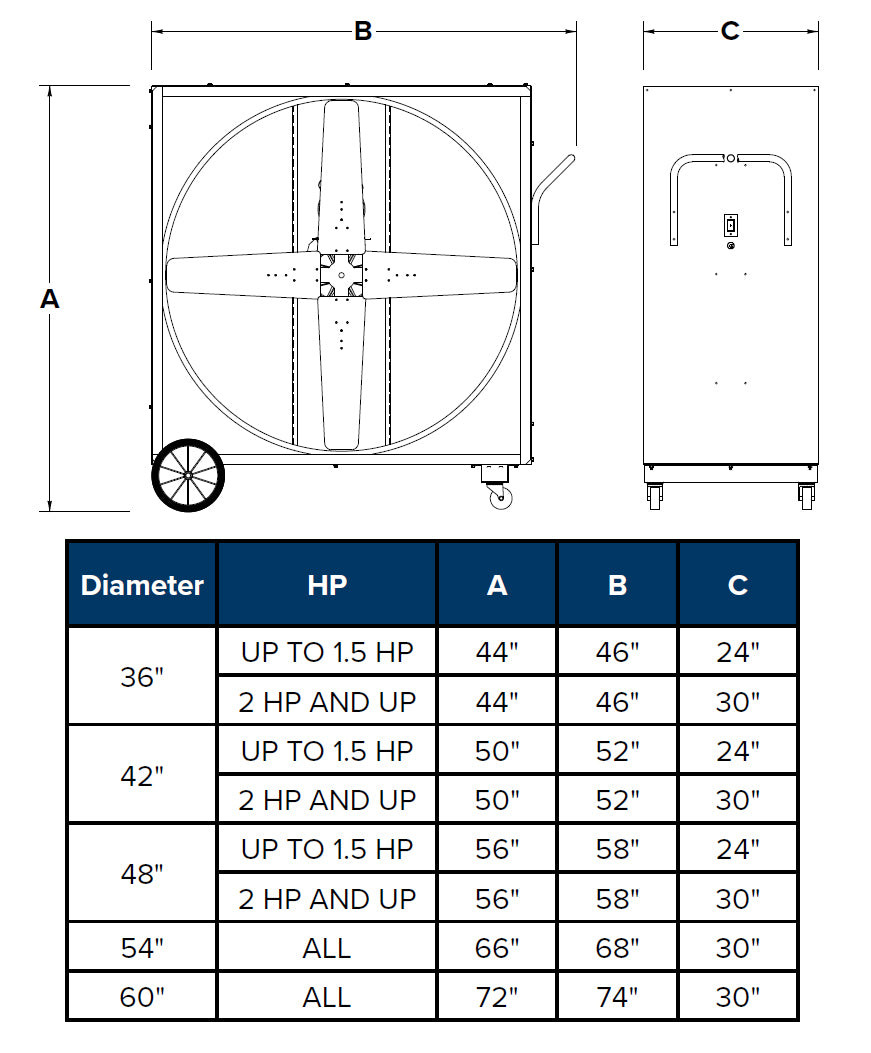 Specs for PVI Heat Buster Portable Boxed Blower Fan 36 inch 230/460 Volt 13110 CFM 3Ph Belt Drive PVI3616-X