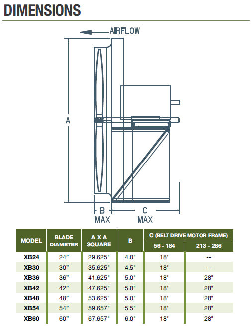 Specs for XB Panel Exhaust Fan 60 inch 28093 CFM 3 Phase XB60T30150M