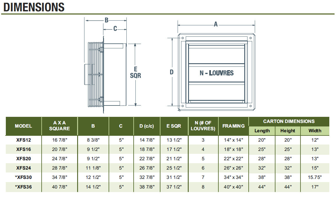 The XFS wall exhaust fans are ideal for commercial applications. They feature smooth, quiet, reliable, maintenance free operation. Fan comes with a 9' cord and grounded plug. The fan has a durable steel construction with powder coat black finish and quiet, aluminum shutters with tie bar to maximize airflow. Installation is easy - simply mount the fan with 4 screws, plug it in and turn it on.
